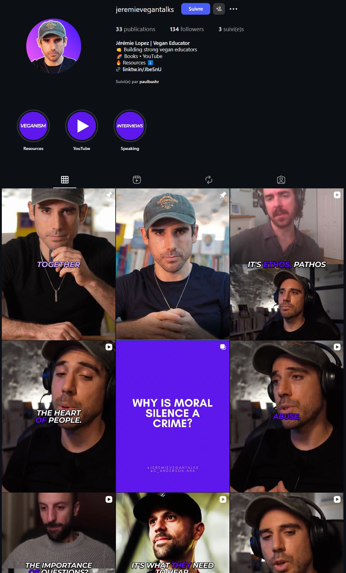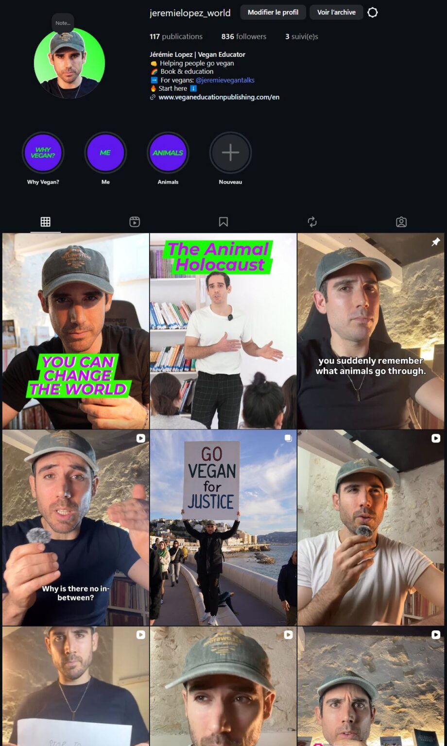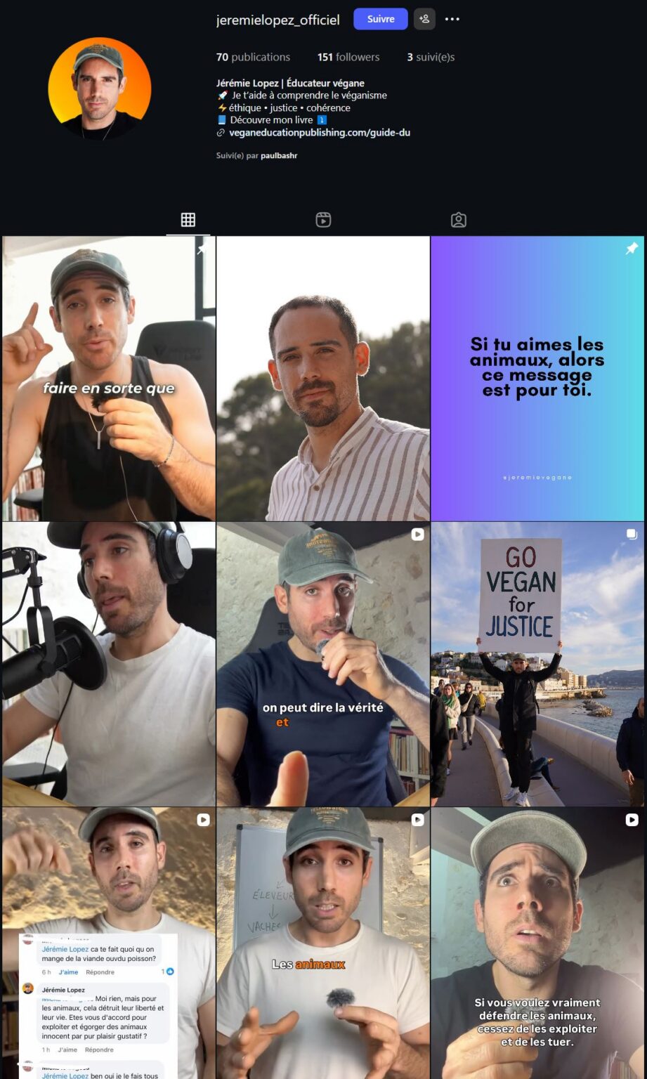 A finales de año, el balance de un año de creación de contenido en Instagram resultó ser muy instructivo pero mixto, a pesar de un trabajo intenso. Pasé de aproximadamente 400 seguidores a 800 en mi cuenta en inglés dedicada a las personas no veganas. También comencé una nueva cuenta en inglés vinculada a mi canal de YouTube en inglés Jeremie Vegan Talks, dirigida a veganos, así como una cuenta de Instagram en francés: